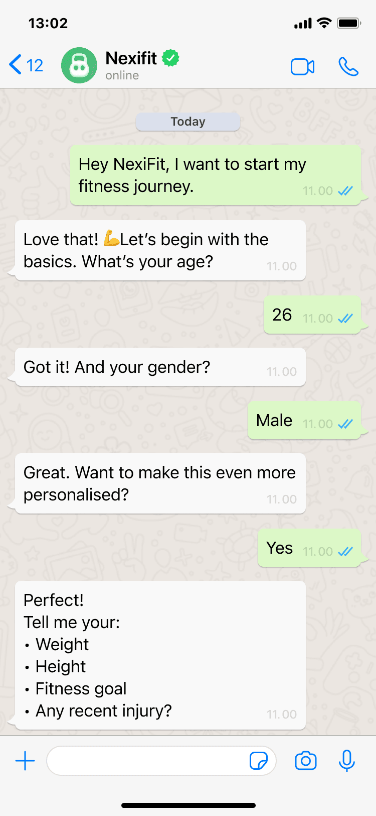 Members start a chat with NexiFit on WhatsApp. We ask key questions like age, height, weight, fitness goals, and injuries to understand each person before creating a plan.